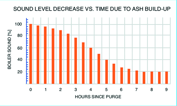 Fig. 1 shows that to optimise effective leak detection operation, the pipe-sets, located in particularly the combustion areas of the boiler, should be cleared of fly ash buildup every 1.5 to 2 hours. It is not practical to reliably achieve this using a manual purging system.