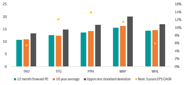 Among the larger discretionary retailers listed on the JSE, most are trading above their two- and five-year average PE ratings, however, delving into history and looking at growth rates changes the picture somewhat. All these retailers, bar TFG, are trading below their ten-year average forward PE’s and all these names are trading a long way off the upper end of their fair value range as expressed by the standard deviation. Growth still looks very solid over the next three years for TFG, PPH and MRP. With the above tailwinds in mind, including the two-pot windfall, there is still opportunity in these names, even more so in the event of any short-term weakness.
