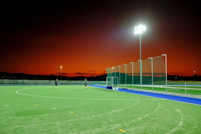 BEKA Schréder’s OMNIBLAST-2-E MAXI floodlights illuminate the Hockey/Athletics field. The OMNIBLAST-E range is the ideal tool for sports venues and other very large area applications that require a lighting solution with the highest efficiency and flexibility to adapt to the different lighting needs. The OMNIBLAST-E meets various lighting applications, ranging from general area lighting to recreational sports lighting up to professional broadcasting requirements, matching the horizontal and vertical lighting levels respectively. A modular concept of optical units means that 1, 2 or 3 modules can be mounted on a similar bracket arrangement to offer the utmost versatility, providing light distributions and lumen packages perfectly adapted to the specifications of the area to be lit.