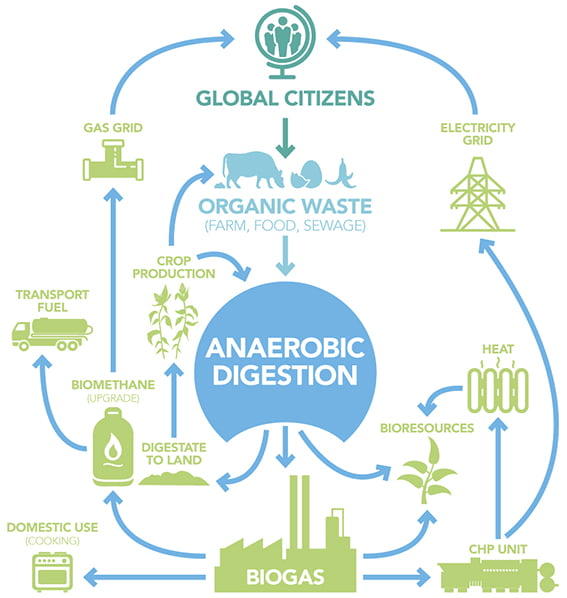 - Human activity produces 105bn tonnes of organic wastes every year globally. By treating these wastes through AD, as well as producing green gas and other valuable bioproducts, the biogas industry could deliver a reduction of over 10% in global GHG emissions by 2030.
