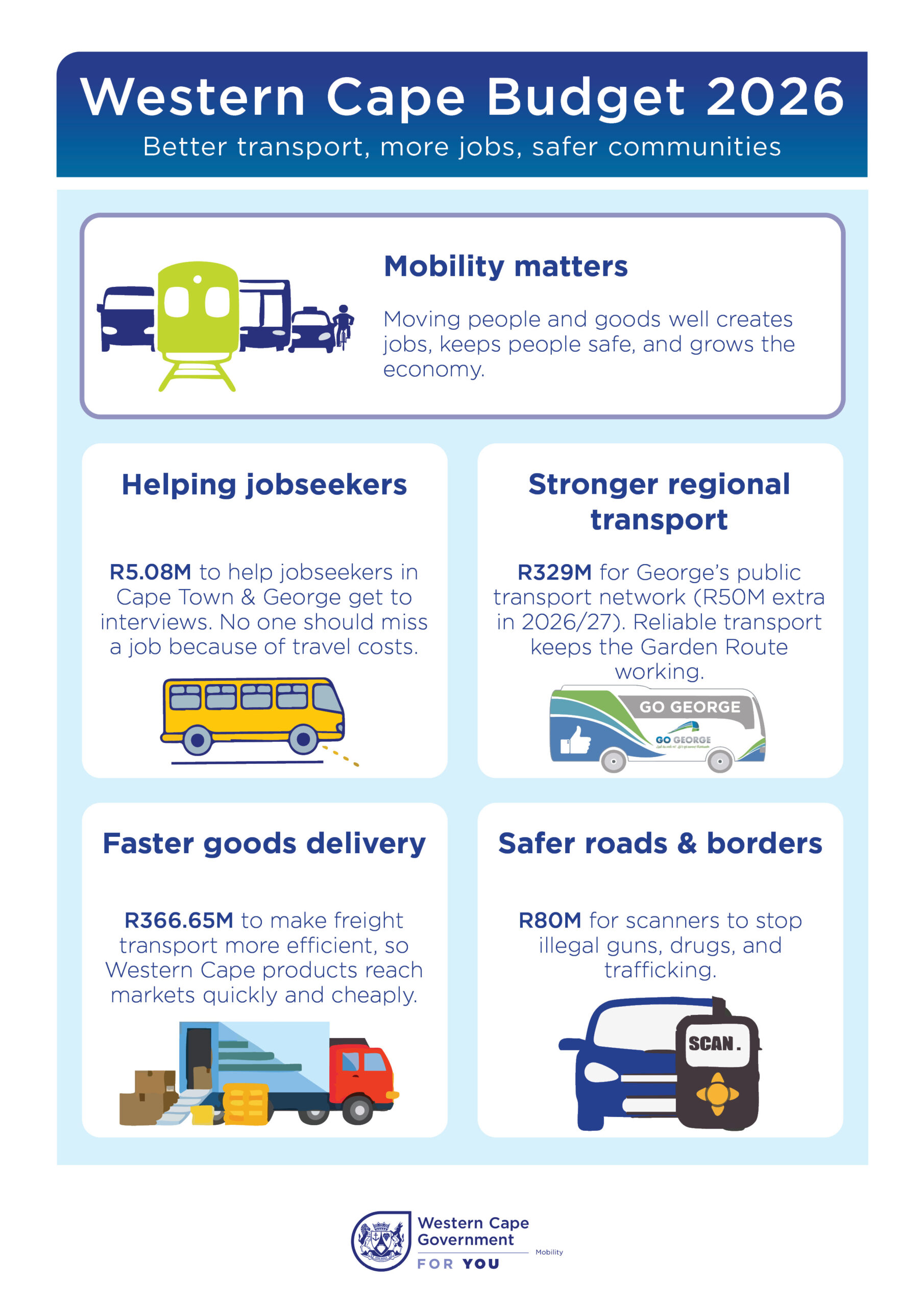 For many residents, the cost of a bus ticket is the only thing standing between them and a job. This budget aims to remove that barrier. In 2026, the Jobseeker Travel Voucher Programme will expand to George, allowing around 7 500 jobseekers in areas like Thembalethu and Pacaltsdorp to travel for free on GO GEORGE buses to attend interviews. The programme is already delivering results in Cape Town, where 35% of users have found permanent work, helping to bring income into households and ease financial pressure at home.