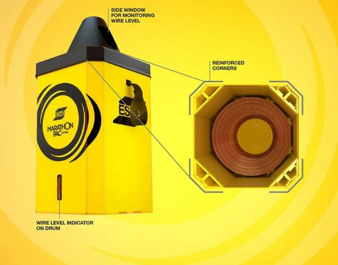ESAB Welding & Cutting Products has introduced Marathon Pac™ Ultra, a new 500kg bulk welding wire drum that features a robust outer box and reinforced corners for stabilizing the inner drum to prevent wire movement during shipping. Marathon Pac Ultra retains ESAB’s trademarked octagonal inner drum, known since 1989 as the industry benchmark, as well as ESAB’s reverse coiling technology to ensure that the wire comes out straight for greater process stability, less spatter and better targeting, positioning the wire at the center of the weld joint.